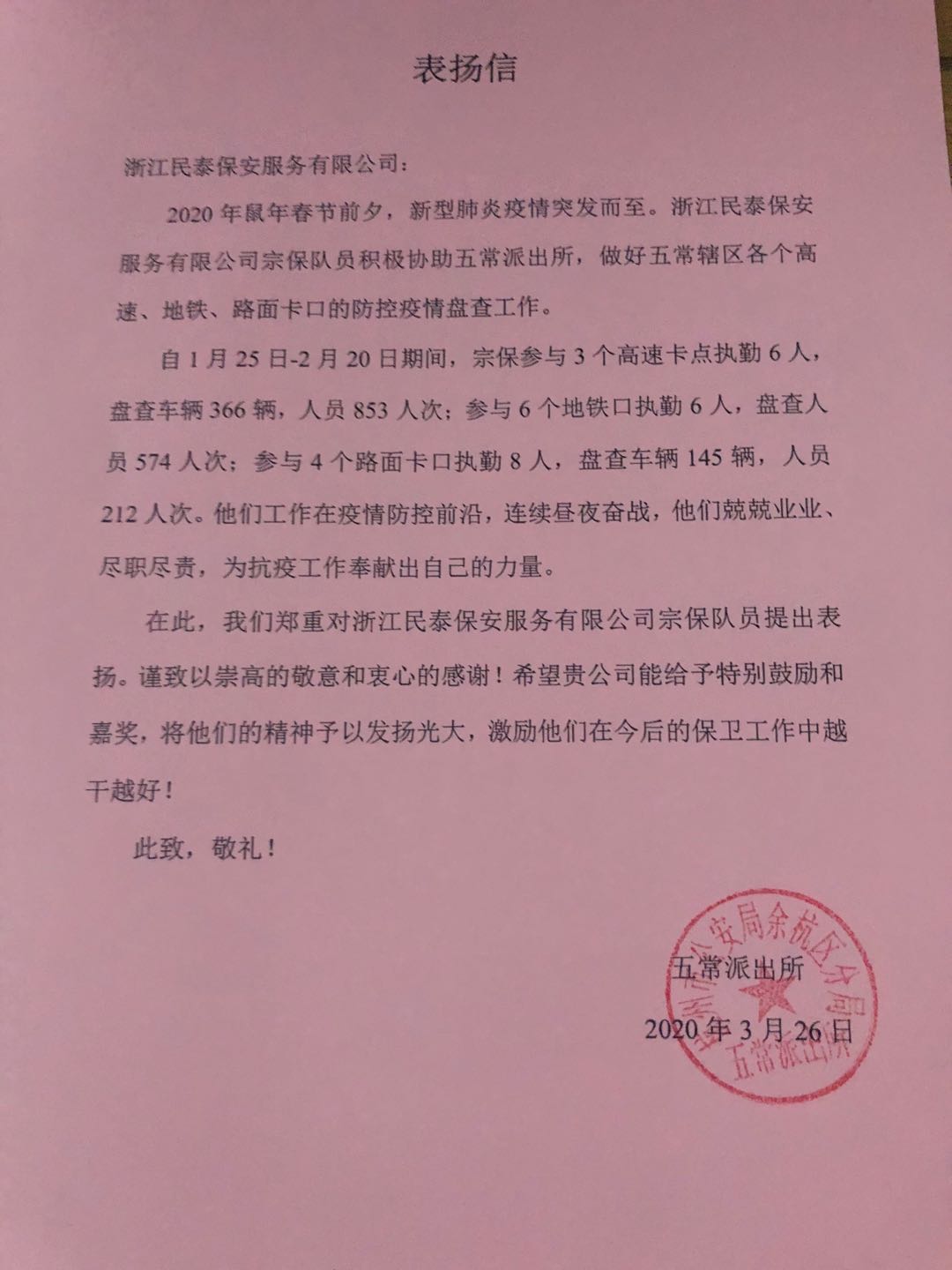 3月26日,浙江民泰保安公司駐杭州市余杭區五常派出所輔警項目收到一封來(lái)自五常派出所的表?yè)P信。