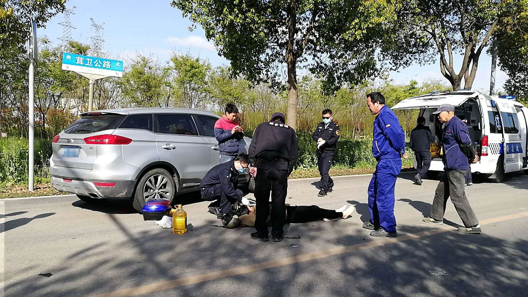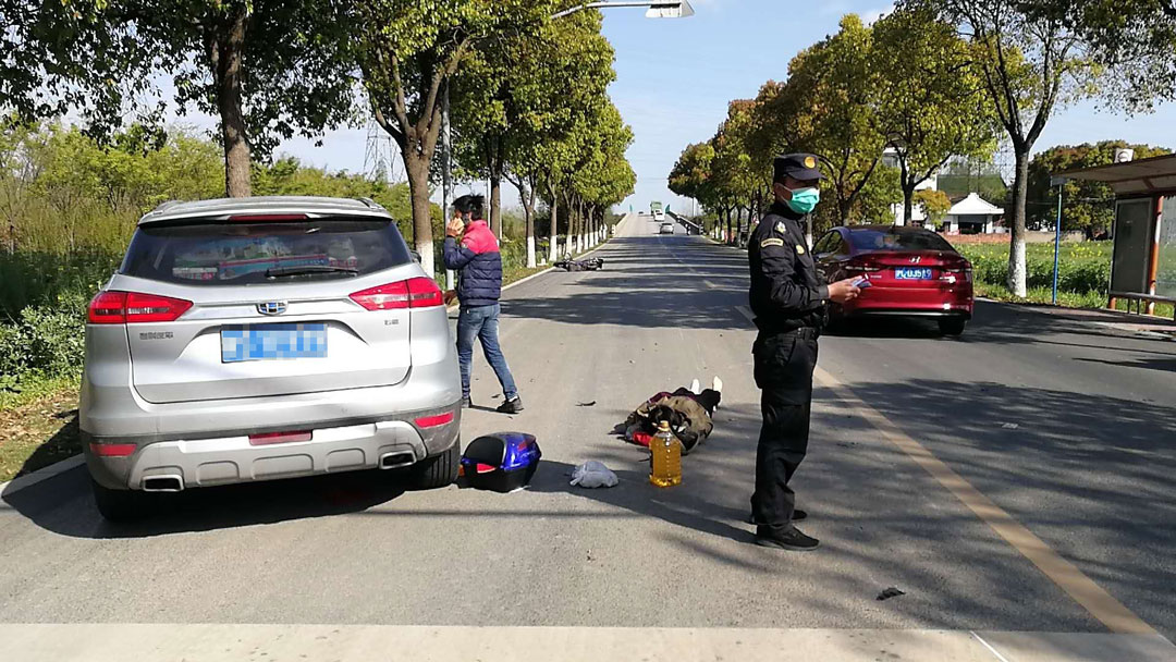 4月5日上午9點(diǎn)左右,宗保公司駐金山衛市容項目隊員張建華、賈鐵雕在上班途經(jīng)茸衛公路查梅路交叉口時(shí),目睹了一起車(chē)禍發(fā)生——一輛機動(dòng)車(chē)與一輛電瓶車(chē)相撞?,F場(chǎng)電瓶車(chē)的零碎部件散落在地上,電瓶車(chē)主受傷躺在路邊不能起身;機動(dòng)車(chē)駕駛員一時(shí)間嚇得六神無(wú)主,不知所措。