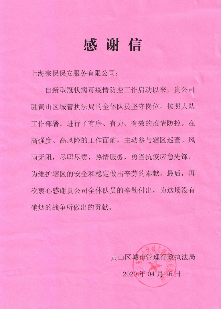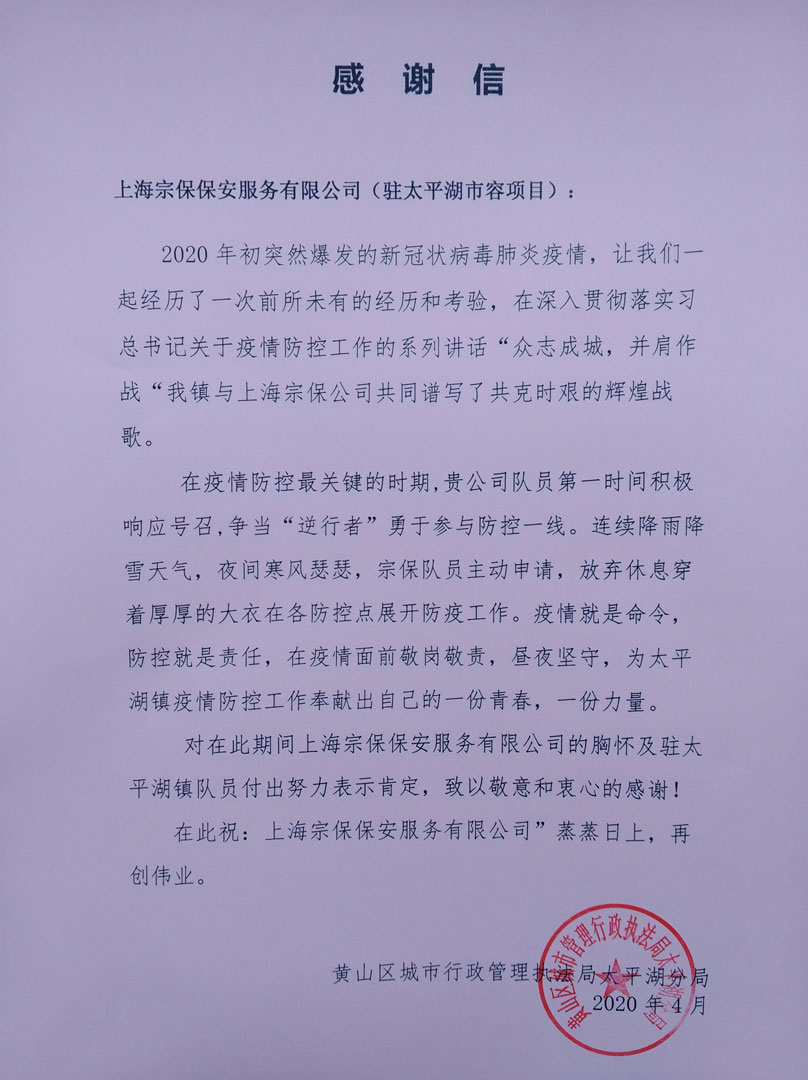 4月16日,宗保公司收到黃山區城市管理行政執法局的一封感謝信,對在疫情防控期間付出辛勞的宗保隊員們表示肯定和感謝。