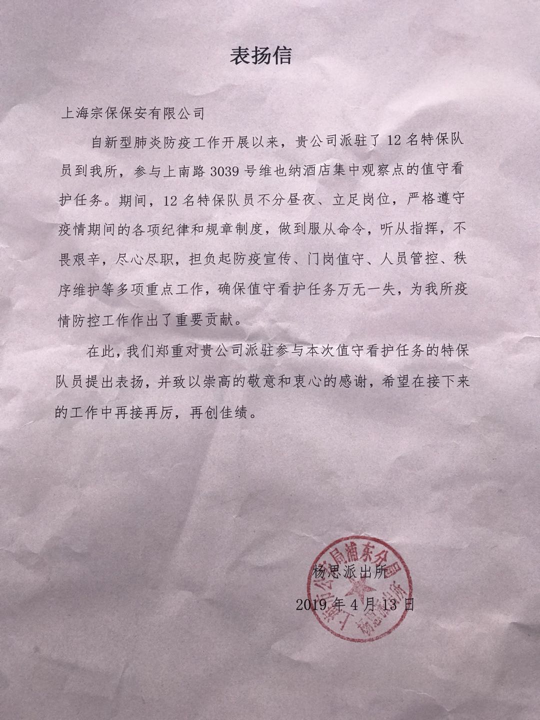 4月13日,宗保公司駐三林鎮市容項目收到楊思派出所送來(lái)的一封表?yè)P信,信中對三林鎮市容項目參與XX酒店集中醫學(xué)觀(guān)察點(diǎn)值守看護任務(wù)的宗保隊員提出表?yè)P和感謝。