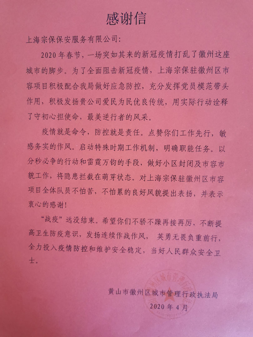 4月17日,宗保公司駐黃山徽州區市容項目收到黃山市徽州區城市管理行政執法局的一封感謝信,信中對參與疫情防控的徽州區市容項目全體保安員提出表?yè)P,并表示感謝。
