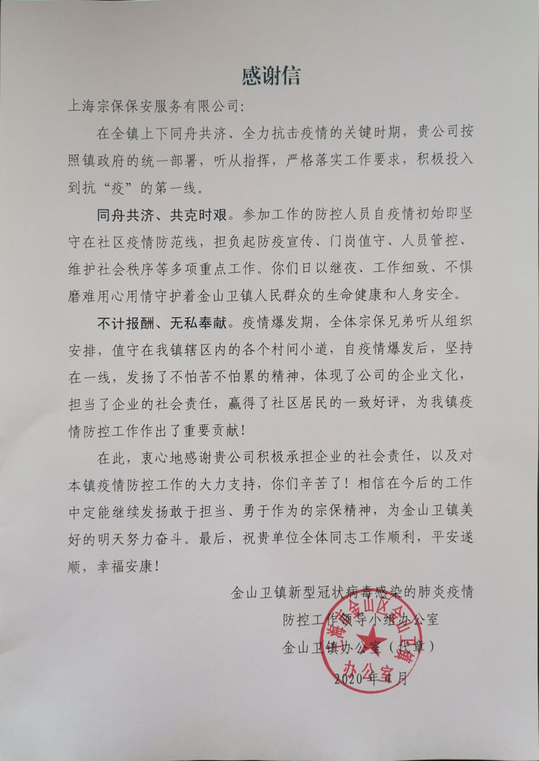 4月21日,宗保公司駐金山衛鎮市容項目收到金山衛鎮新冠疫情防控工作領(lǐng)導小組辦公室和金山衛鎮辦公室聯(lián)合發(fā)來(lái)的一封感謝信,對在疫情防控期間付出辛勞的宗保隊員們表示肯定和感謝。