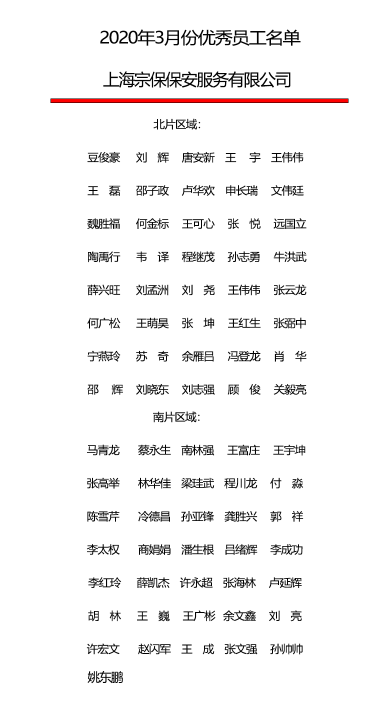 三月份疫情防控形勢持續向好、生產(chǎn)生活秩序加快恢復,宗保員工發(fā)揚無(wú)私奉獻、忘我工作、連續奮戰的精神,配合甲方出色地完成了疫情防控工作和復工復產(chǎn)工作,其中涌現出了一批優(yōu)秀員工。為表彰先進(jìn),樹(shù)立典型,激勵后進(jìn),在各項目推薦,各部門(mén)審定把關(guān)的基礎上,經(jīng)公司董事會(huì )研究,決定對3月份工作表現優(yōu)異的豆俊豪等128名優(yōu)秀員工,予以通報表彰獎勵(獎金已隨三月份工資發(fā)放)。